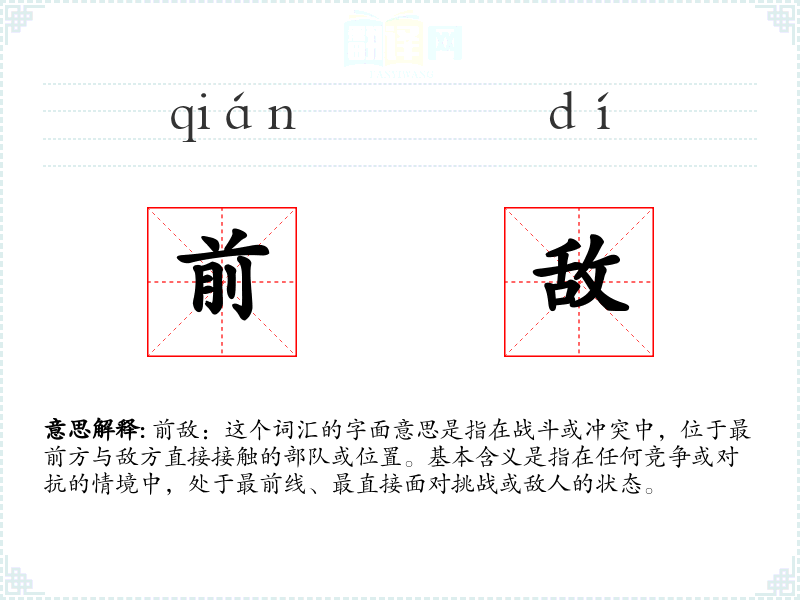 前敌:这个词汇的字面意思是指在战斗或冲突中,位于最前方与敌方直接接触的部队或位置。基本含义是指在任何竞争或对抗的情境中,处于最前线、最直接面对挑战或敌人的状态。