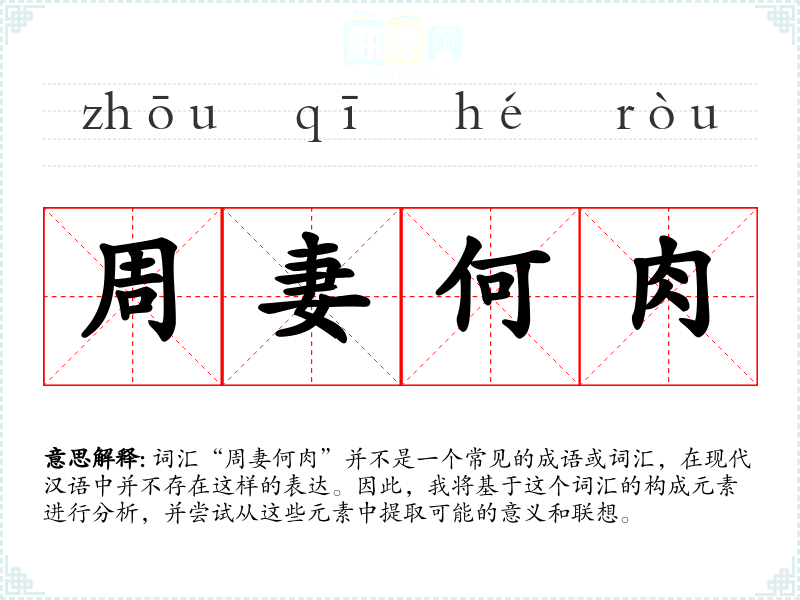 词汇“周妻何肉”并不是一个常见的成语或词汇,在现代汉语中并不存在这样的表达。因此,我将基于这个词汇的构成元素进行分析,并尝试从这些元素中提取可能的意义和联想。