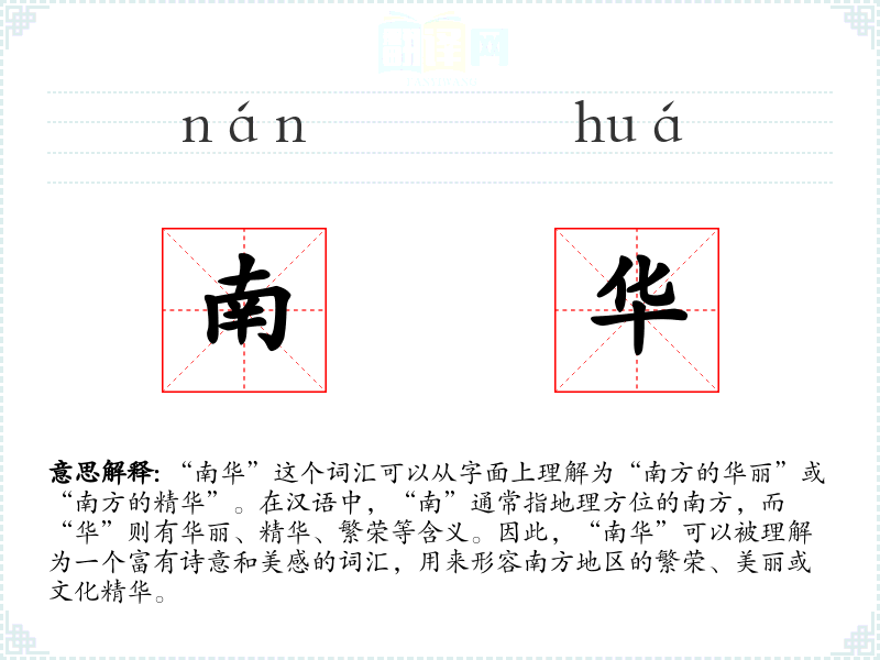 “南华”这个词汇可以从字面上理解为“南方的华丽”或“南方的精华”。在汉语中,“南”通常指地理方位的南方,而“华”则有华丽、精华、繁荣等含义。因此,“南华”可以被理解为一个富有诗意和美感的词汇,用来形容南方地区的繁荣、美丽或文化精华。