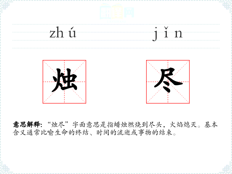 “烛尽”字面意思是指蜡烛燃烧到尽头,火焰熄灭。基本含义通常比喻生命的终结、时间的流逝或事物的结束。