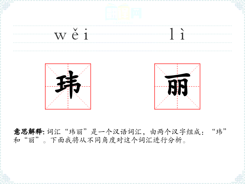- “玮丽”作为一个复合词,结合了两个字的意义,强调美丽且珍贵。