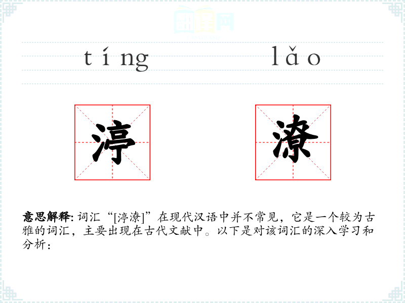 词汇“[渟潦]”在现代汉语中并不常见,它是一个较为古雅的词汇,主要出现在古代文献中。以下是对该词汇的深入学*和分析: