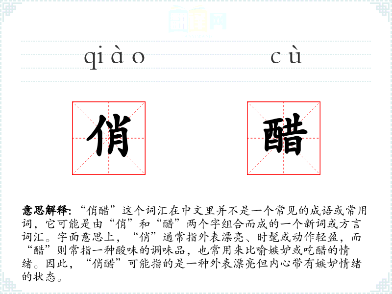 由于“俏醋”不是一个标准词汇,其词源和演变可能不明确。它可能是现代网络语言或方言中的一个创新词汇,用以形容一种特定的情感状态。