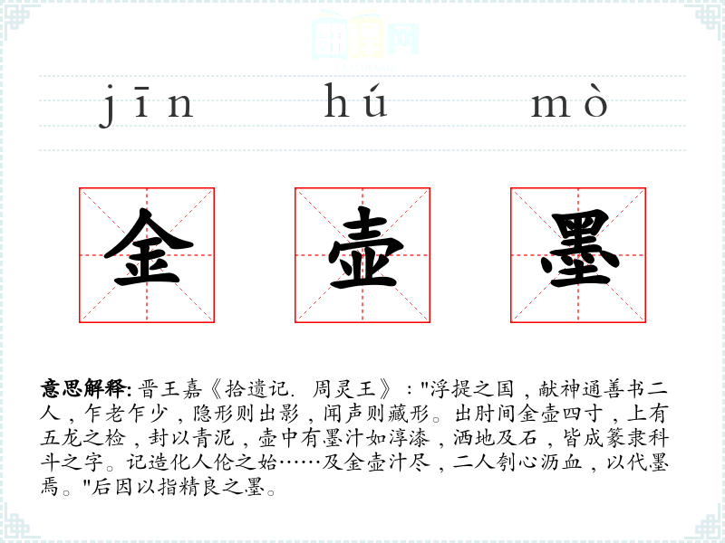 1.晋王嘉《拾遗记.周灵王》﹕"浮提之国﹐献神通善书二人﹐乍老乍少﹐隐形则出影﹐闻声则藏形。出肘间金壶四寸﹐上有五龙之检﹐封以青泥﹐壶中有墨汁如淳漆﹐洒地及石﹐皆成篆隶科斗之字。记造化人伦之始……及金壶汁尽﹐二人刳心沥血﹐以代墨焉。"后因以指精良之墨。
