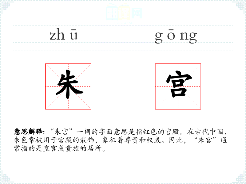 在**文化中,红色象征着喜庆和吉祥,因此“朱宫”不仅代表了皇家的权威,也体现了人们对美好生活的向往。在社会背景中,这个词可能与皇权、历史和文化遗产紧密相关。