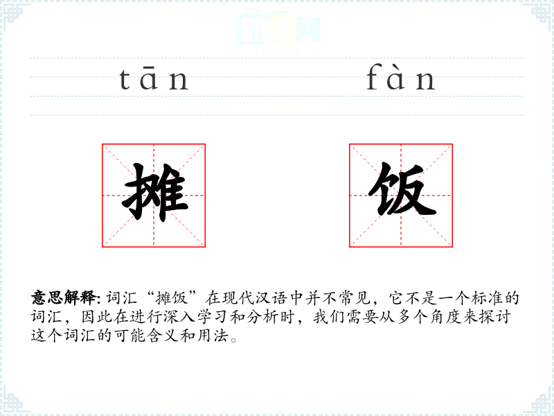 词汇“摊饭”在现代汉语中并不常见,它不是一个标准的词汇,因此在进行深入学习和分析时,我们需要从多个角度来探讨这个词汇的可能含义和用法。