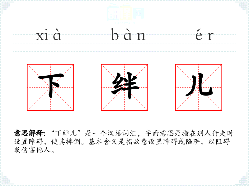 - 口语:在日常口语中,这个词常用来形容某人故意使坏或捣乱,如“他总是喜欢下绊儿,让人防不胜防。”