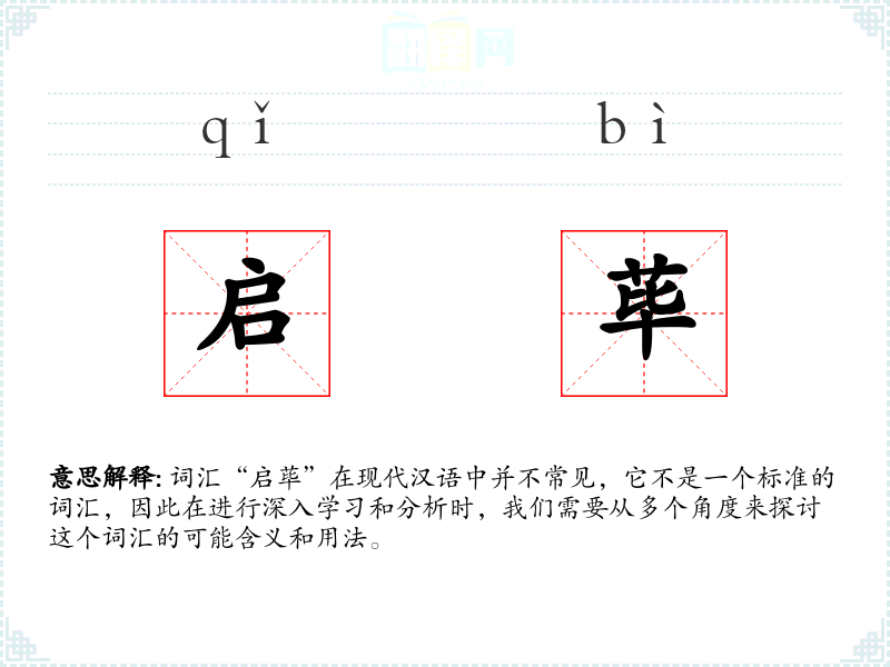 由于“启荜”不是一个标准词汇,它在不同语境下的使用非常有限。如果它出现在某个特定的文学作品或专业领域中,可能需要结合具体的上下文来理解其含义。