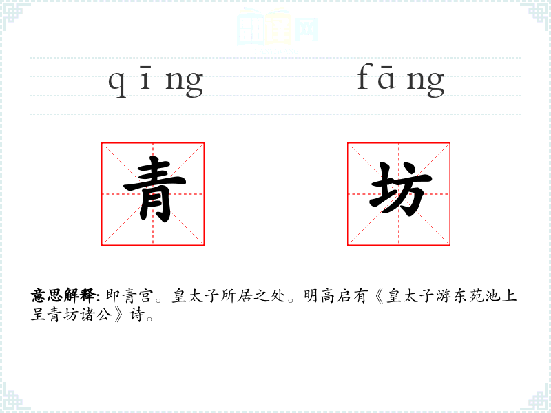 即青宫。皇太子所居之处。明高启有《皇太子游东苑池上呈青坊诸公》诗。