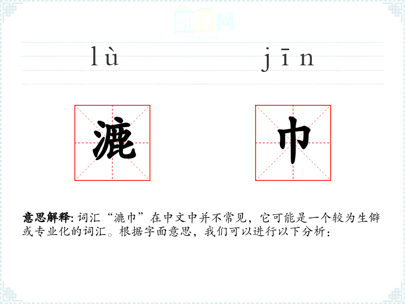 词汇“漉巾”在中文中并不常见,它可能是一个较为生僻或专业化的词汇。根据字面意思,我们可以进行以下分析: