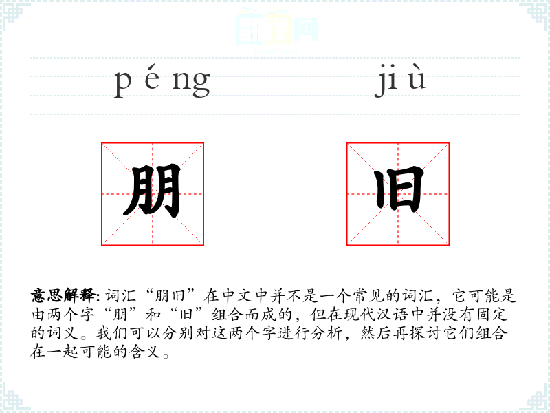词汇“朋旧”在中文中并不是一个常见的词汇,它可能是由两个字“朋”和“旧”组合而成的,但在现代汉语中并没有固定的词义。我们可以分别对这两个字进行分析,然后再探讨它们组合在一起可能的含义。