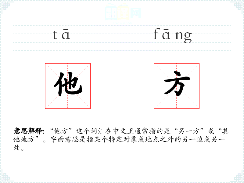 - 口语:在日常对话中,“他方”可能简单地指代“另一边”或“其他地方”,如“他方观点”可能指不同于当前讨论的另一种看法。