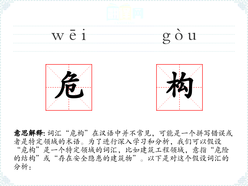 词汇“危构”在汉语中并不常见,可能是一个拼写错误或者是特定领域的术语。为了进行深入学习和分析,我们可以假设“危构”是一个特定领域的词汇,比如建筑工程领域,意指“危险的结构”或“存在安全隐患的建筑物”。以下是对这个假设词汇的分析: