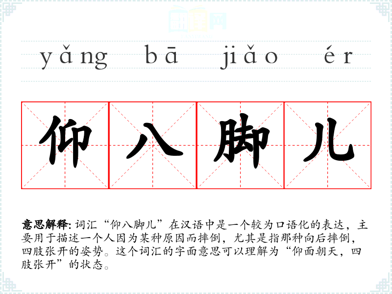 词汇“仰八脚儿”在汉语中是一个较为口语化的表达,主要用于描述一个人因为某种原因而摔倒,尤其是指那种向后摔倒,四肢张开的姿势。这个词汇的字面意思可以理解为“仰面朝天,四肢张开”的状态。