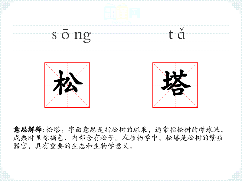松塔:字面意思是指松树的球果,通常指松树的雌球果,成熟时呈棕褐色,内部含有松子。在植物学中,松塔是松树的繁殖器官,具有重要的生态和生物学意义。