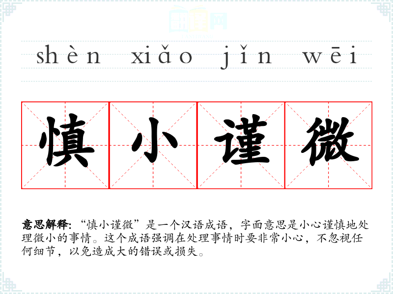 “慎小谨微”是一个汉语成语,字面意思是小心谨慎地处理微小的事情。这个成语强调在处理事情时要非常小心,不忽视任何细节,以免造成大的错误或损失。