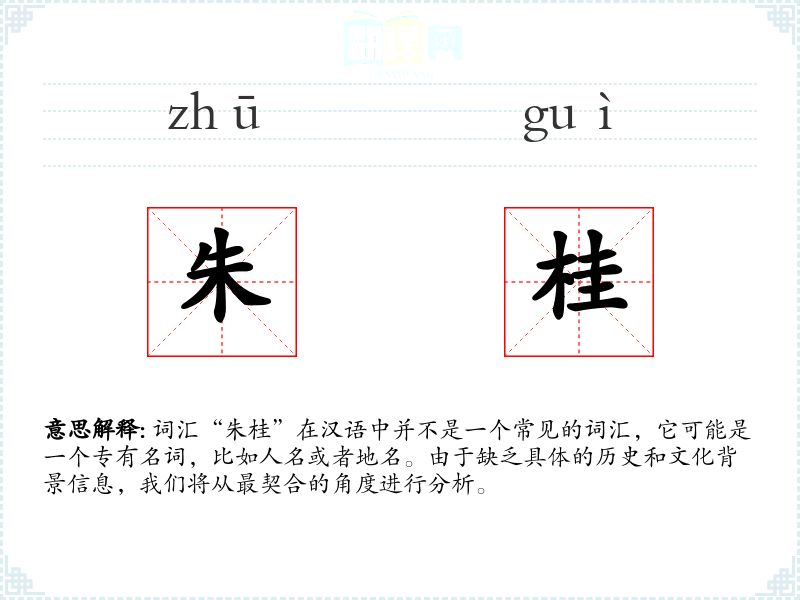 词汇“朱桂”在汉语中并不是一个常见的词汇,它可能是一个专有名词,比如人名或者地名。由于缺乏具体的历史和文化背景信息,我们将从最契合的角度进行分析。
