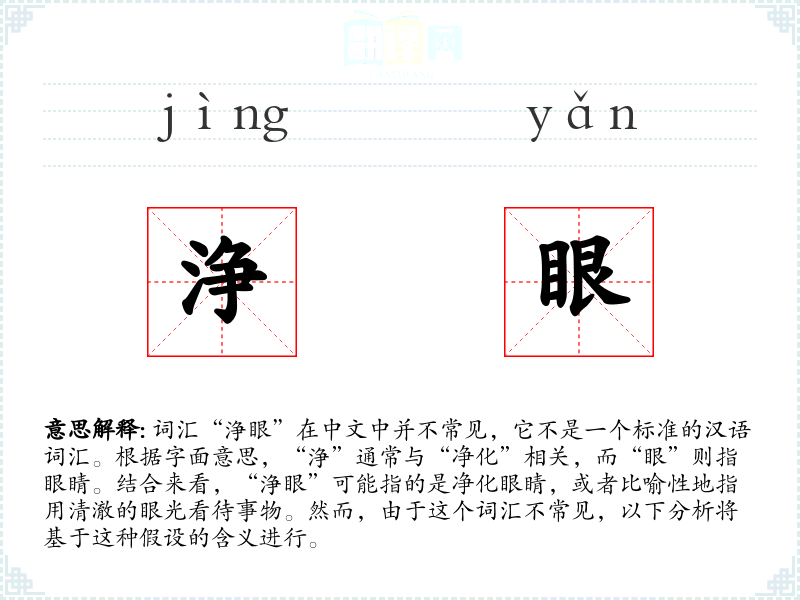 由于“浄眼”不是一个标准词汇,其词源和演变不详。可能是由“净化”和“眼睛”两个词组合而成的新词。