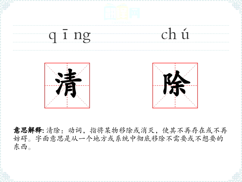 清除:动词,指将某物移除或消灭,使其不再存在或不再妨碍。字面意思是从一个地方或系统中彻底移除不需要或不想要的东西。