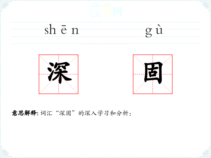 “深固”由“深”和“固”两个字组成,“深”表示深度或程度,“固”表示稳固或固定。在古代汉语中,“固”已有稳固之意,而“深”则强调了这种稳固的程度。随着语言的发展,“深固”逐渐被用来形容各种深层次的稳固状态。