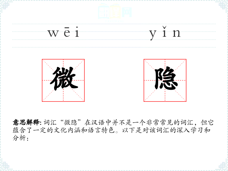 词汇“微隐”在汉语中并不是一个非常常见的词汇,但它蕴含了一定的文化内涵和语言特色。以下是对该词汇的深入学*和分析: