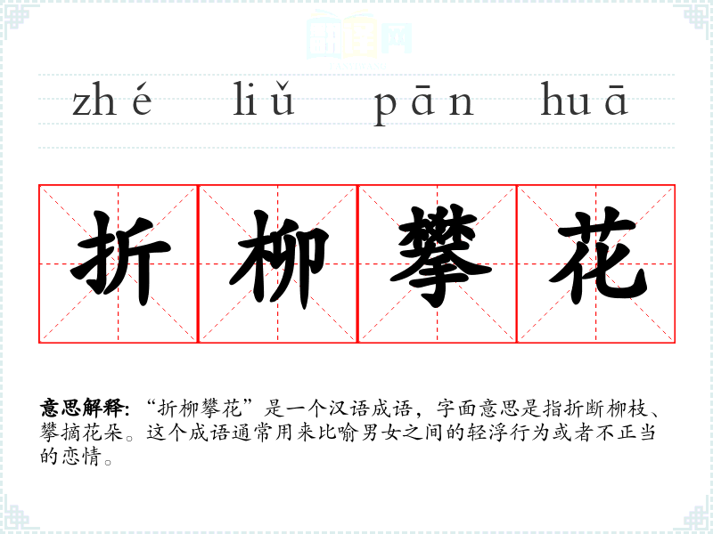 “折柳攀花”是一个汉语成语,字面意思是指折断柳枝、攀摘花朵。这个成语通常用来比喻男女之间的轻浮行为或者不正当的恋情。