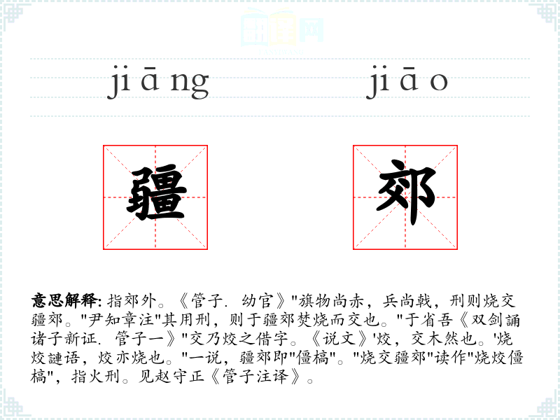 指郊外。《管子.幼官》"旗物尚赤,兵尚戟,刑则烧交疆郊。"尹知章注"其用刑,则于疆郊焚烧而交也。"于省吾《双剑誦诸子新证.管子一》"交乃烄之借字。《说文》'烄,交木然也。'烧烄謰语,烄亦烧也。"一说,疆郊即"僵槁"。"烧交疆郊"读作"烧烄僵槁",指火刑。见赵守正《管子注译》。
