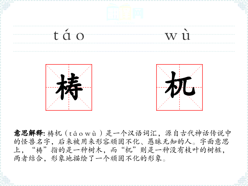 梼杌(táo wù)是一个汉语词汇,源自古代神话传说中的怪兽名字,后来被用来形容顽固不化、愚昧无知的人。字面意思上,“梼”指的是一种树木,而“杌”则是一种没有枝叶的树桩,两者结合,形象地描绘了一个顽固不化的形象。