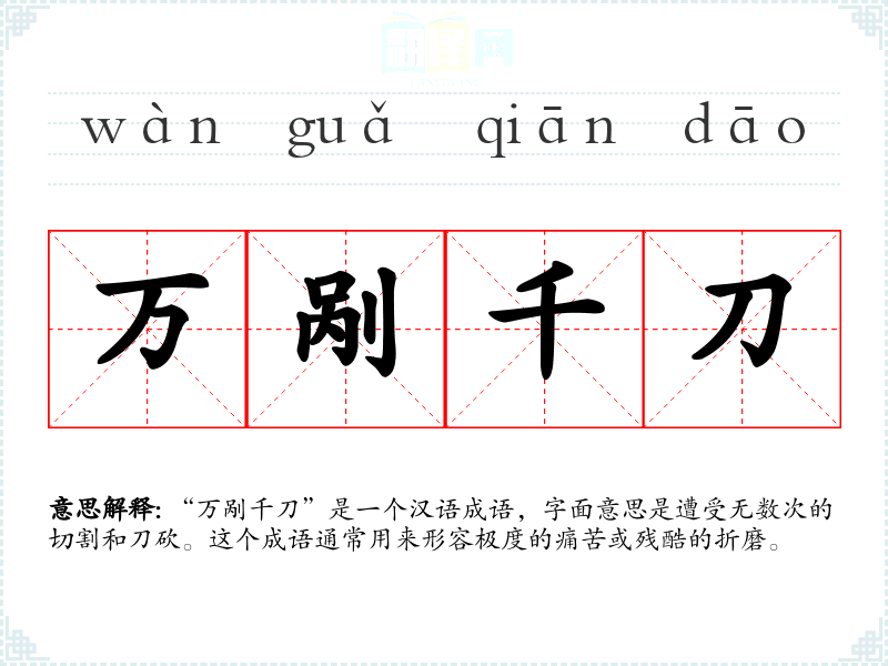 “万剐千刀”是一个汉语成语,字面意思是遭受无数次的切割和刀砍。这个成语通常用来形容极度的痛苦或残酷的折磨。
