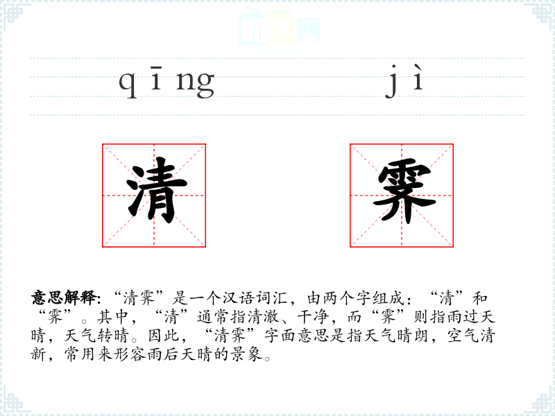 “清霁”一词的词源较为古老,其中“清”字在古代汉语中已有清澈、干净的含义,而“霁”字则源自《说文解字》,意为雨止。随着时间的推移,“清霁”逐渐被用来形容雨后天晴的景象,成为一种文学修辞。
