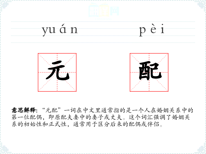 “元配”一词在中文里通常指的是一个人在婚姻关系中的第一位配偶,即原配夫妻中的妻子或丈夫。这个词汇强调了婚姻关系的初始性和正式性,通常用于区分后来的配偶或伴侣。