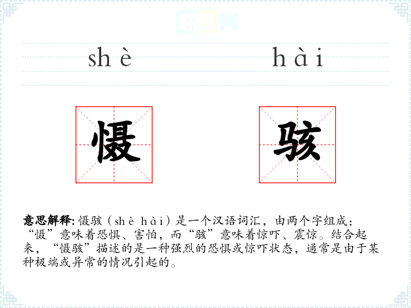 “慑”和“骇”都是古代汉语词汇,有着悠久的历史。在古代文献中,这两个字常用来描述人们在面对自然灾害、战争或其他极端情况时的反应。随着时间的推移,这些词汇的使用逐渐扩展到描述更广泛的恐惧和惊吓情境。