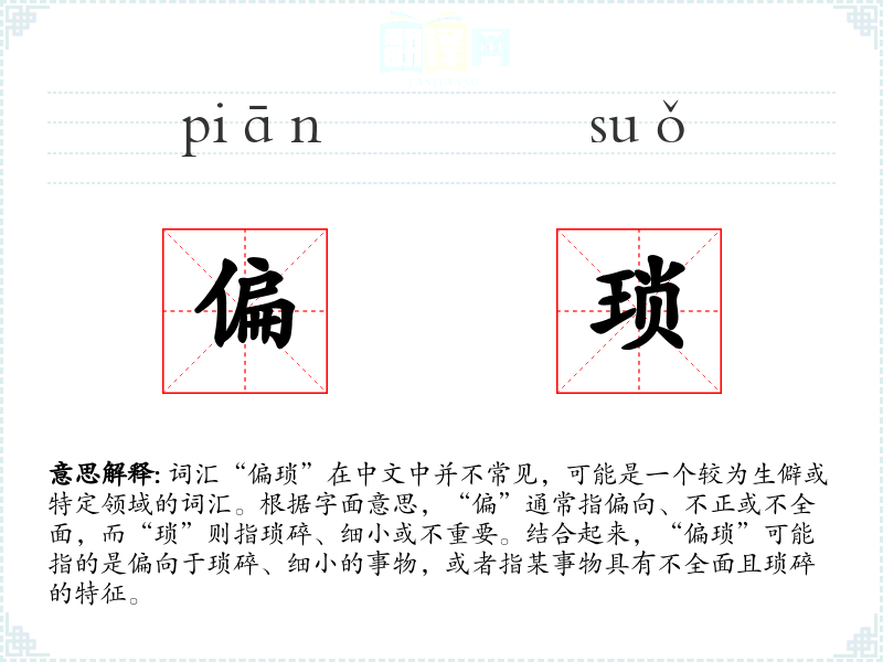 词汇“偏琐”在中文中并不常见,可能是一个较为生僻或特定领域的词汇。根据字面意思,“偏”通常指偏向、不正或不全面,而“琐”则指琐碎、细小或不重要。结合起来,“偏琐”可能指的是偏向于琐碎、细小的事物,或者指某事物具有不全面且琐碎的特征。