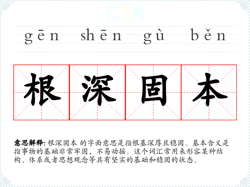 根深固本 的字面意思是指根基深厚且稳固。基本含义是指事物的基础非常牢固,不易动摇。这个词汇常用来形容某种结构、体系或者思想观念等具有坚实的基础和稳固的状态。