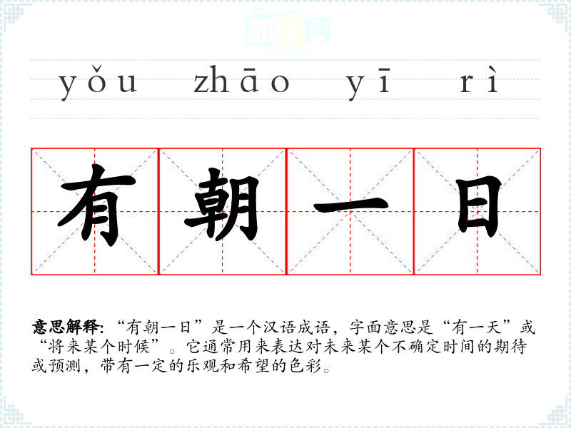 “有朝一日”是一个汉语成语,字面意思是“有一天”或“将来某个时候”。它通常用来表达对未来某个不确定时间的期待或预测,带有一定的乐观和希望的色彩。