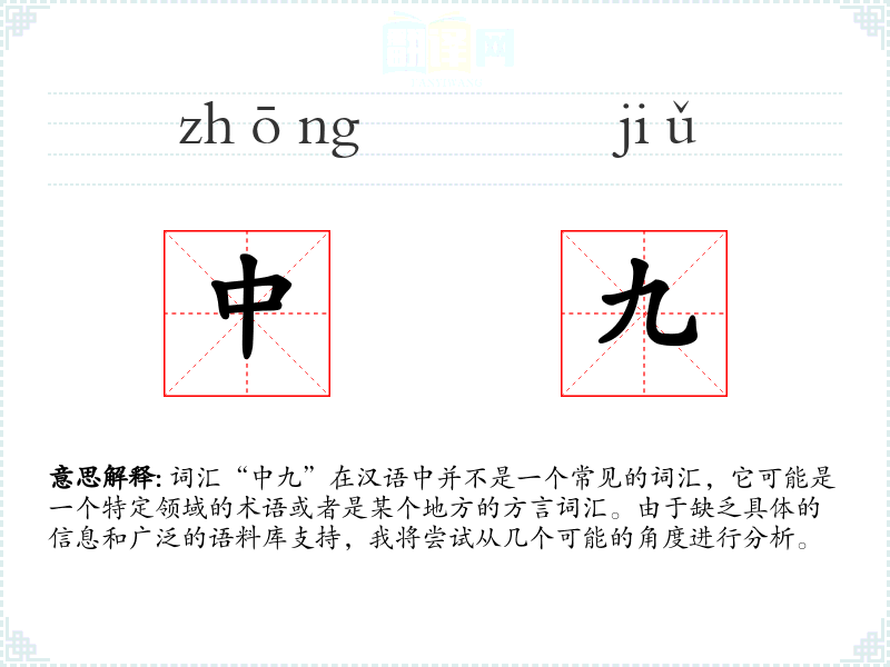 由于“中九”不是一个标准汉语词汇,它的字面意思和基本含义可能需要结合具体语境来解释。例如,它可能是指某个时间点、某个位置、某个等级或者某个特定的物品。