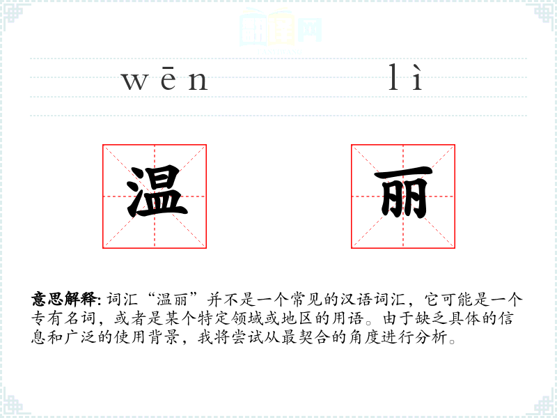 词汇“温丽”并不是一个常见的汉语词汇,它可能是一个专有名词,或者是某个特定领域或地区的用语。由于缺乏具体的信息和广泛的使用背景,我将尝试从最契合的角度进行分析。