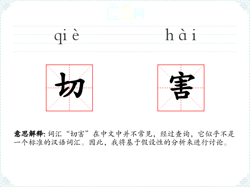 假设“切害”是一个合成词,由“切”和“害”组成。在汉语中,“切”可以表示切割、切断等动作,而“害”则通常指伤害、损害。因此,“切害”可能指的是通过切割或其他方式造成的伤害或损害。