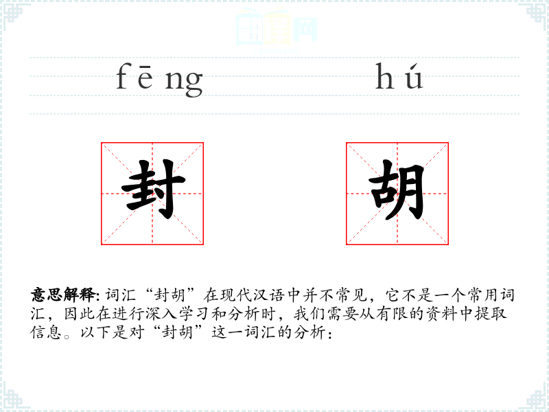 词汇“封胡”在现代汉语中并不常见,它不是一个常用词汇,因此在进行深入学*和分析时,我们需要从有限的资料中提取信息。以下是对“封胡”这一词汇的分析: