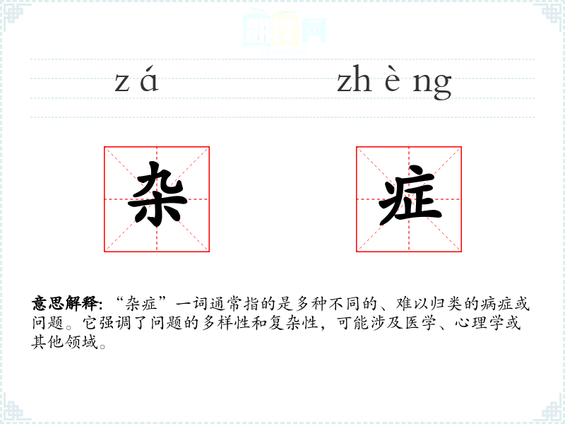 - 医学领域:在医学中,“杂症”可能指患者同时患有多种不同的疾病或症状,这些症状可能相互关联,也可能独立存在。