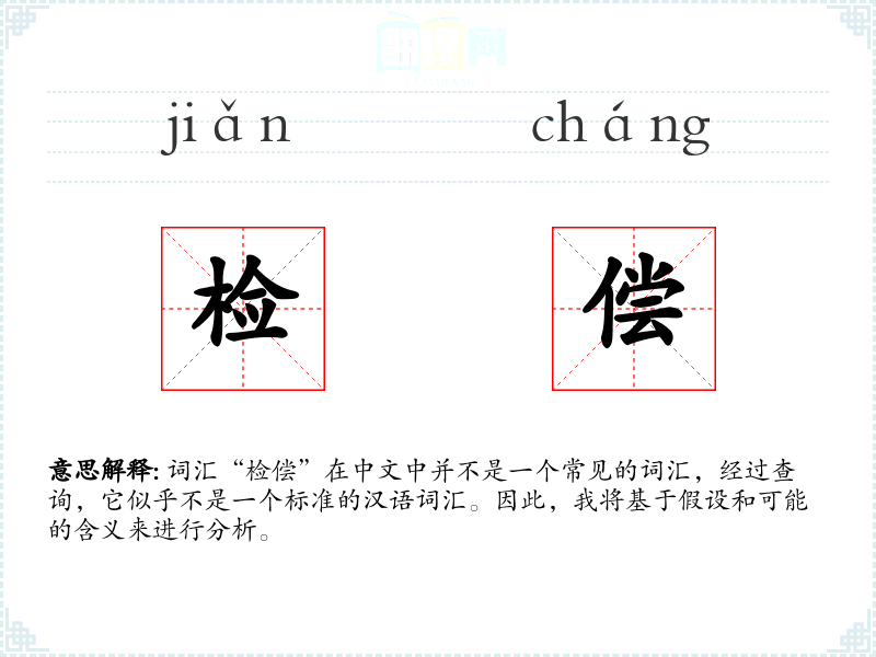 词汇“检偿”在中文中并不是一个常见的词汇,经过查询,它似乎不是一个标准的汉语词汇。因此,我将基于假设和可能的含义来进行分析。