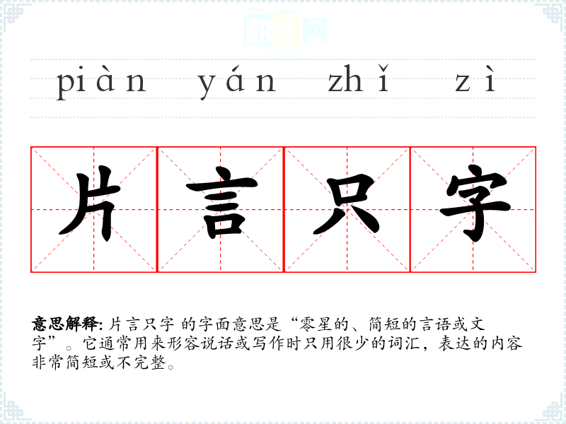 片言只字 的字面意思是“零星的、简短的言语或文字”。它通常用来形容说话或写作时只用很少的词汇,表达的内容非常简短或不完整。