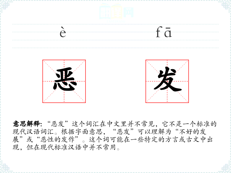 “恶发”这个词汇在中文里并不常见,它不是一个标准的现代汉语词汇。根据字面意思,“恶发”可以理解为“不好的发展”或“恶性的发作”。这个词可能在一些特定的方言或古文中出现,但在现代标准汉语中并不常用。