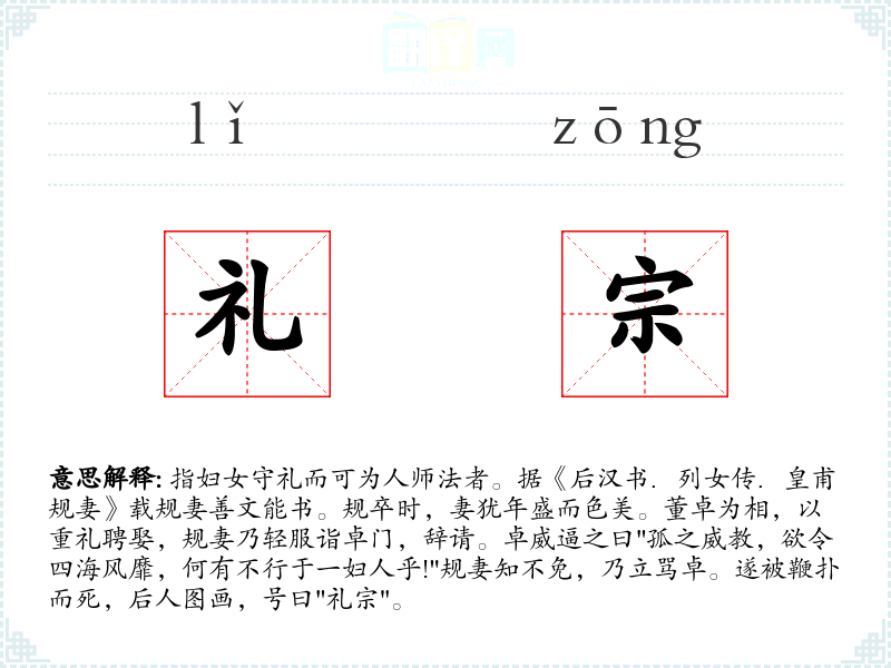 1.指妇女守礼而可为人师法者。据《后汉书.列女传.皇甫规妻》载规妻善文能书。规卒时,妻犹年盛而色美。董卓为相,以重礼聘娶,规妻乃轻服诣卓门,辞请。卓威逼之曰"孤之威教,欲令四海风靡,何有不行于一妇人乎!"规妻知不免,乃立骂卓。遂被鞭扑而死,后人图画,号曰"礼宗"。