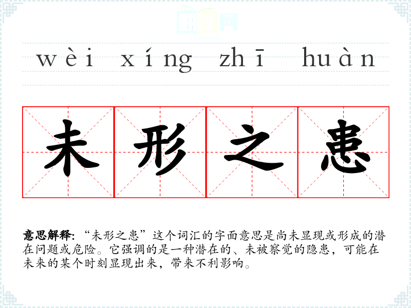 “未形之患”这个词汇的字面意思是尚未显现或形成的潜在问题或危险。它强调的是一种潜在的、未被察觉的隐患,可能在未来的某个时刻显现出来,带来不利影响。