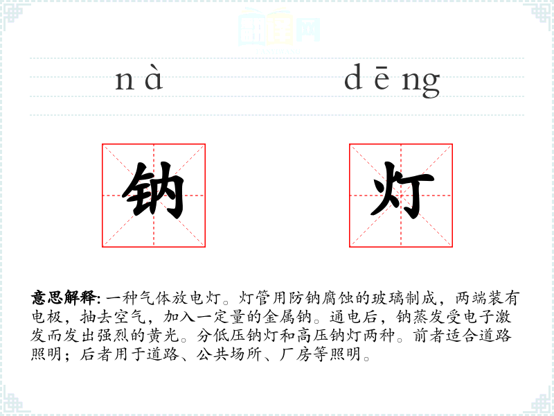 1.一种气体放电灯。灯管用防钠腐蚀的玻璃制成,两端装有电极,抽去空气,加入一定量的金属钠。通电后,钠蒸发受电子激发而发出强烈的黄光。分低压钠灯和高压钠灯两种。前者适合道路照明;后者用于道路、公共场所、厂房等照明。