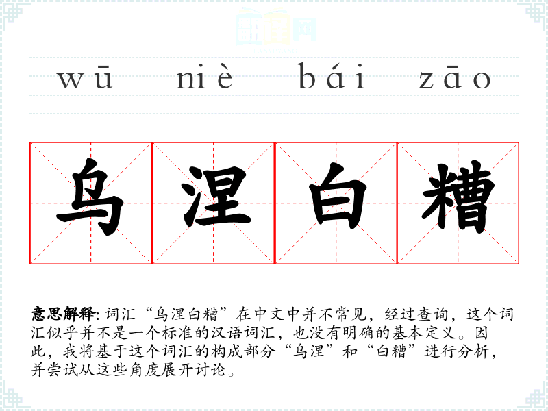 词汇“乌涅白糟”在中文中并不常见,经过查询,这个词汇似乎并不是一个标准的汉语词汇,也没有明确的基本定义。因此,我将基于这个词汇的构成部分“乌涅”和“白糟”进行分析,并尝试从这些角度展开讨论。