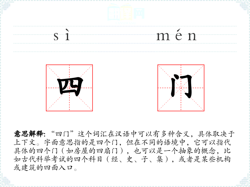 在其他语言中,如英语,可能没有直接对应“四门”的词汇,但可以用“four doors”来表达类似的概念。不同文化中对“四”这个数字的象征意义可能有所不同,但“门”作为入口的概念是普遍的。