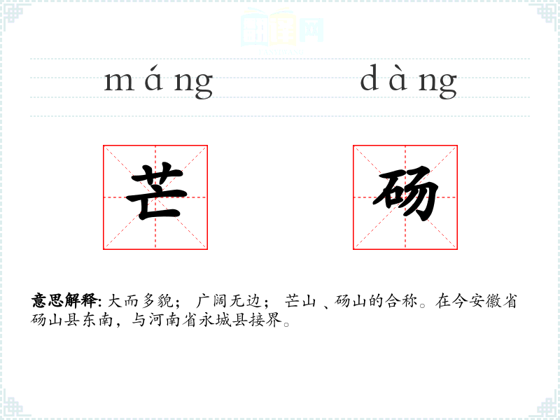 大而多貌; 广阔无边; 芒山﹑砀山的合称。在今安徽省砀山县东南,与河南省永城县接界。