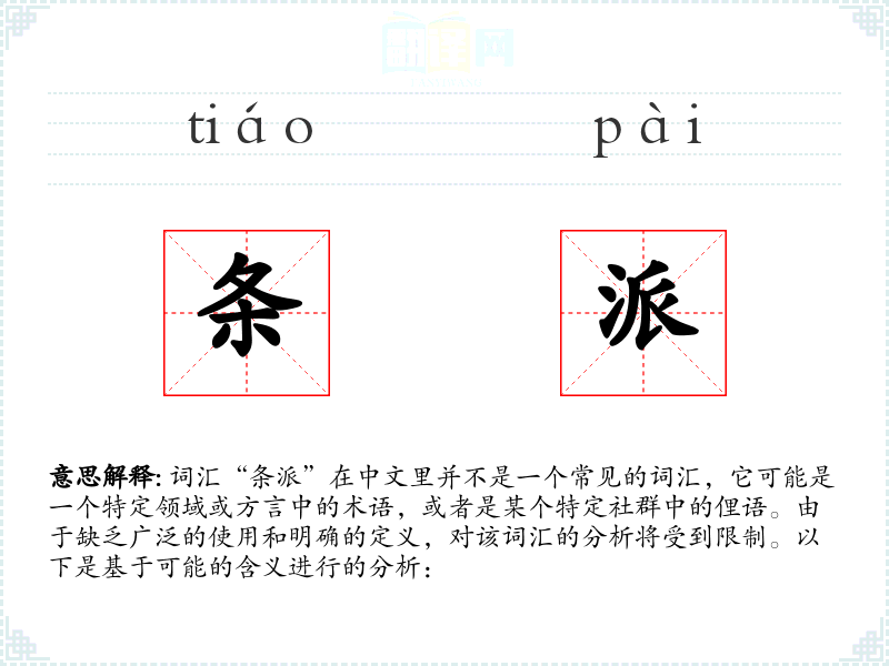 由于“条派”不是一个标准词汇,它在不同语境下的使用可能非常有限。在某些特定的学术或专业领域,它可能被用来描述一种特定的研究方法或理论框架。